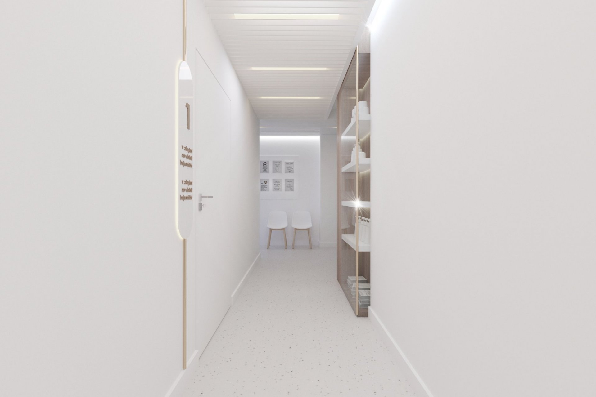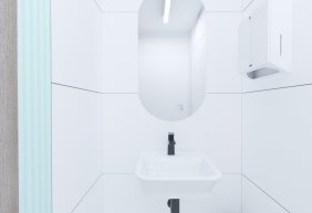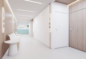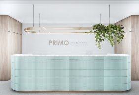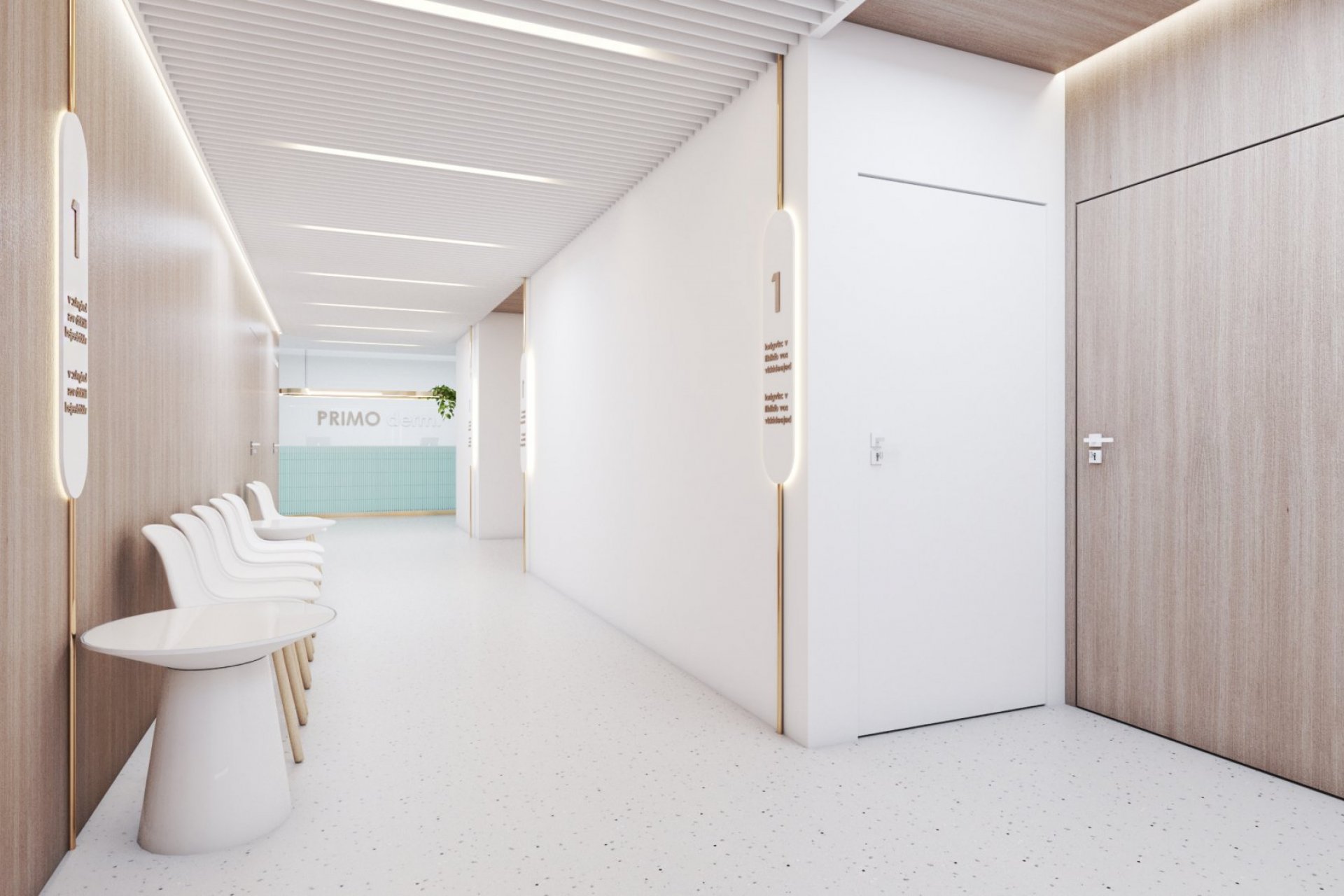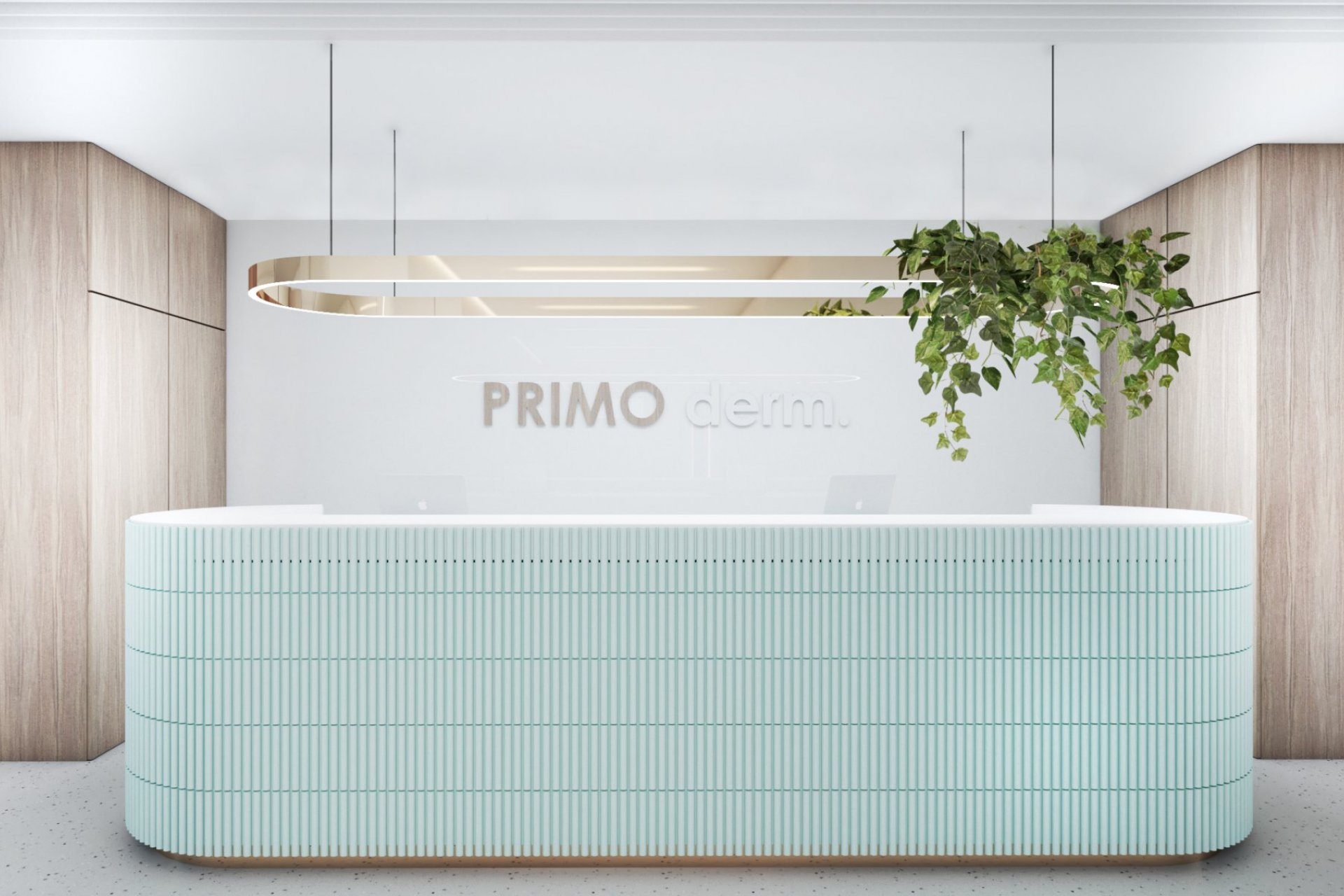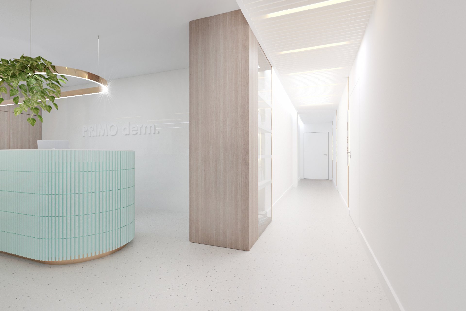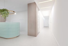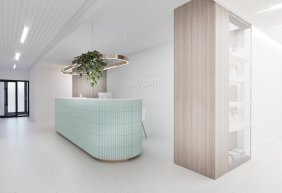 • lada stanowiąca serce kliniki posiada niepowtarzalny i wyjątkowy kształt elipsy w kolorze mięty. Pionowe podziały uzyskano porzez oklejenie płytką, ozdobnymi lamelami z laminatu. Rejestrację podkreśla takż