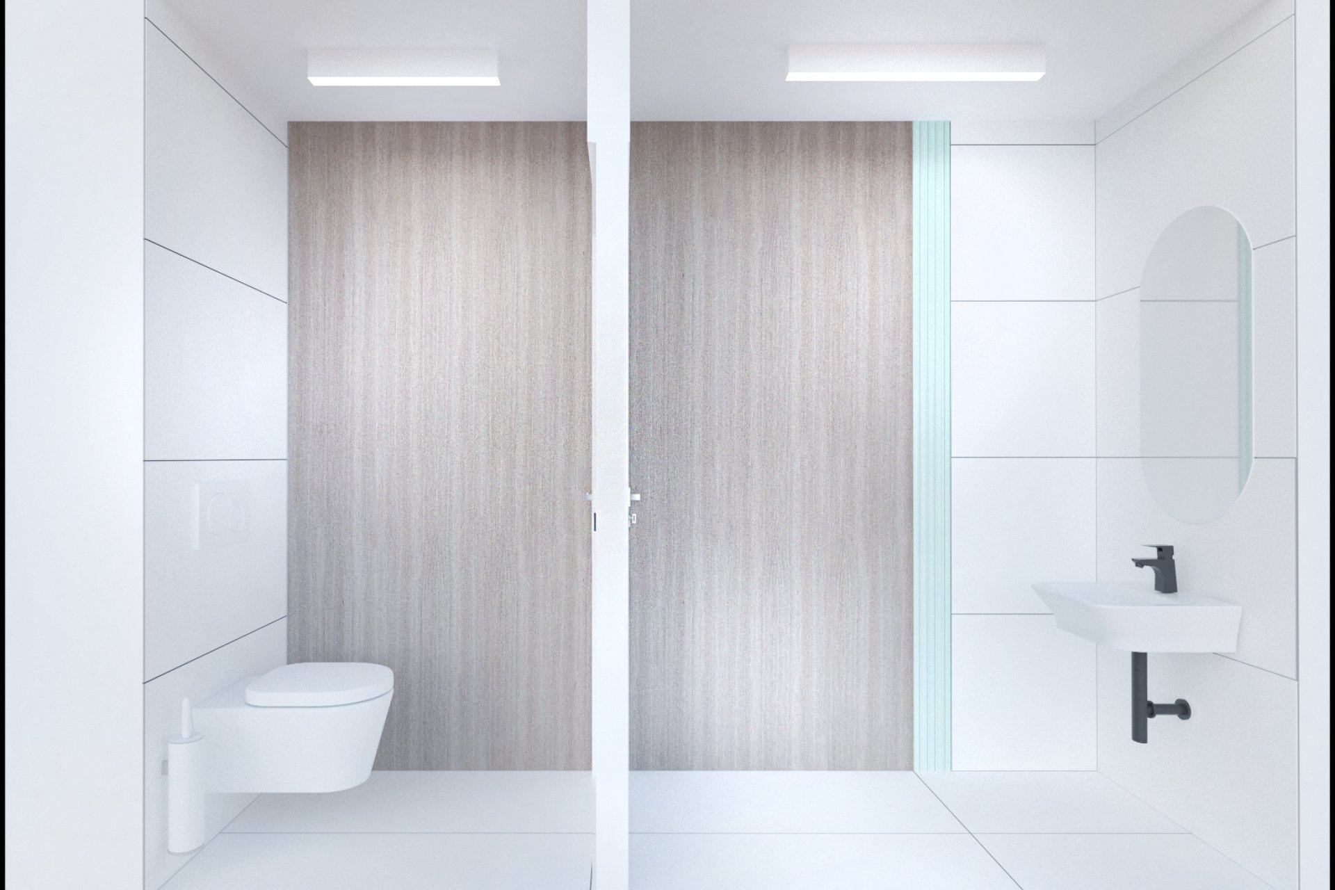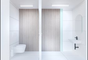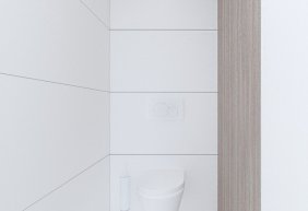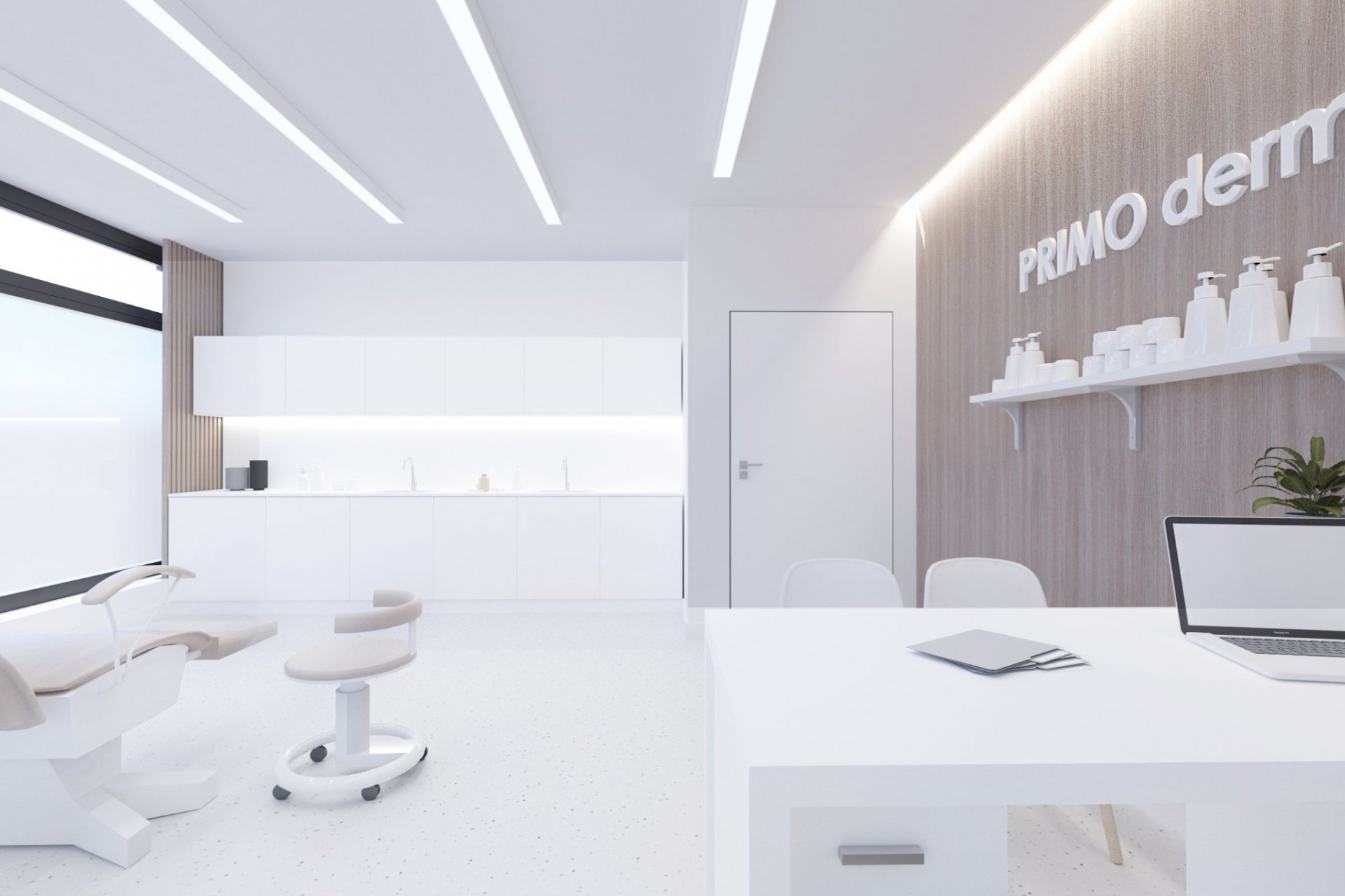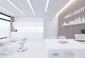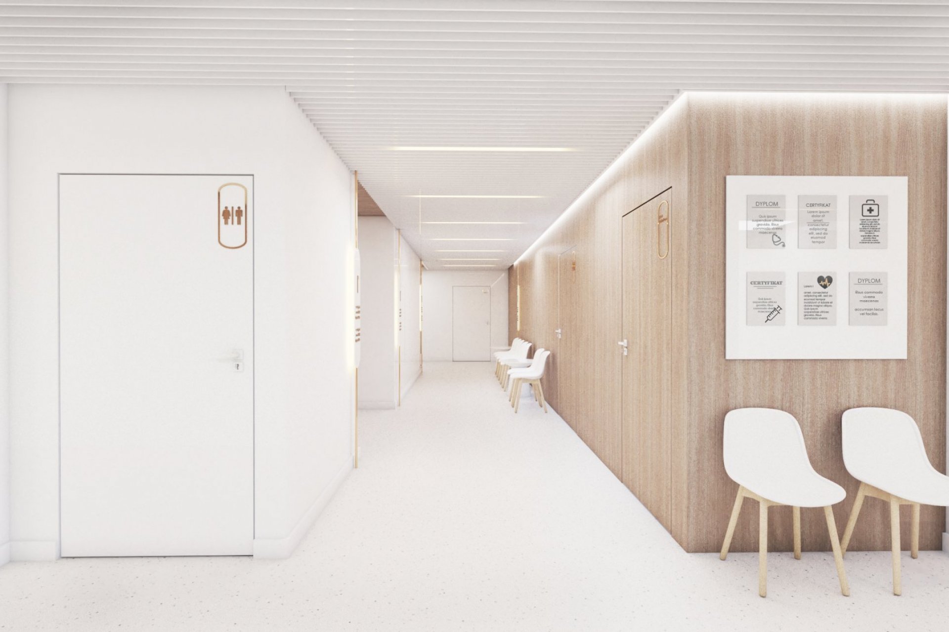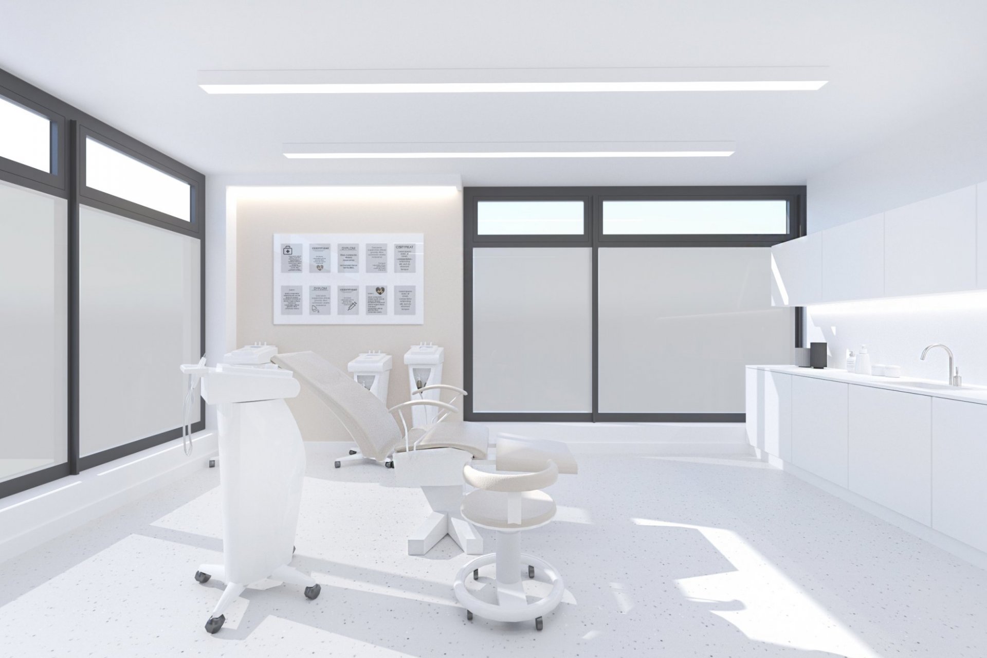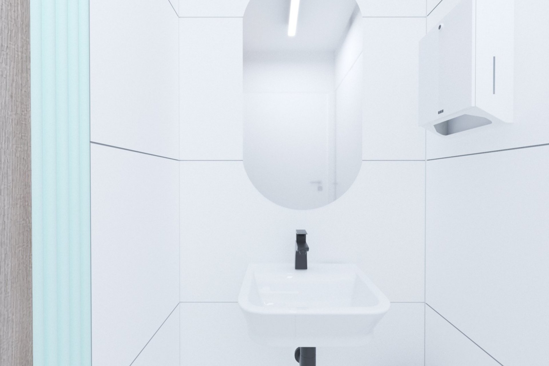 • lada stanowiąca serce kliniki posiada niepowtarzalny i wyjątkowy kształt elipsy w kolorze mięty. Pionowe podziały uzyskano porzez oklejenie płytką, ozdobnymi lamelami z laminatu. Rejestrację podkreśla takż